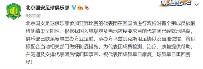 北京国安足球俱乐部参加亚冠比赛的代表团在回国前进行双检时有个别成员核酸检测结果呈阳性。根据我国入境规定及当地防疫要求目前代表团已经就地隔离,俱乐部已联系赛事主办方亚足联、承办方乌兹别克斯坦足协以及当地使馆,将积极配合当地相关部门做好防疫措施,为代表团成员检测、治疗、康复提供帮助,并沟通及安排代表团后续归国事宜。祝代表团成员早日康复,球员早日重回赛场!