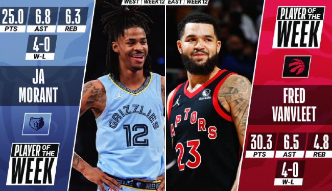 北京时间1月11日,NBA官方公布了第12周的东西部最佳球员,西部由灰熊球星贾-莫兰特获得,东部猛龙球星弗雷德-范弗里特当选。
