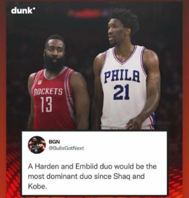 在社交媒体上,美媒晒出了哈登和恩比德的合照,并且配文写道:“哈登和恩比德的双人组将会是OK组合之后最有统治力的双人组合”。随后,奥尼尔转发了这条动态。